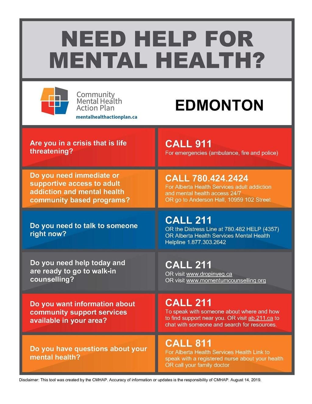- 24 Hour Distress Line – 780-482-HELP (4357) / 1-800-232-7288 if outside of the greater Edmonton region
